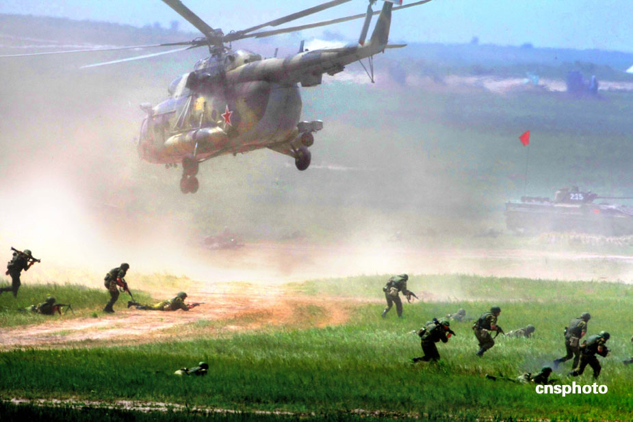 中國、俄羅斯兩軍總參謀長,7月23日上午到沈陽軍區洮南合同戰術訓練基地,觀看“和平使命2009”聯合反恐軍事演習。雙方以陸軍和空軍為主,中方參演部隊包括1個陸軍戰斗群和1個空軍戰斗群。俄方參演兵力包括1個陸軍加強摩步營、1個空降突擊連和部分空軍兵力,雙方投入兵力兩千多人。中新社發 宋吉河 攝