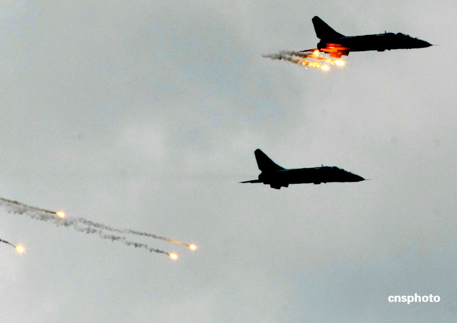 中國(guó)、俄羅斯兩軍總參謀長(zhǎng),7月23日上午到沈陽(yáng)軍區(qū)洮南合同戰(zhàn)術(shù)訓(xùn)練基地,觀看“和平使命2009”聯(lián)合反恐軍事演習(xí)。雙方以陸軍和空軍為主,中方參演部隊(duì)包括1個(gè)陸軍戰(zhàn)斗群和1個(gè)空軍戰(zhàn)斗群。俄方參演兵力包括1個(gè)陸軍加強(qiáng)摩步營(yíng)、1個(gè)空降突擊連和部分空軍兵力,雙方投入兵力兩千多人。中新社發(fā) 宋吉河 攝