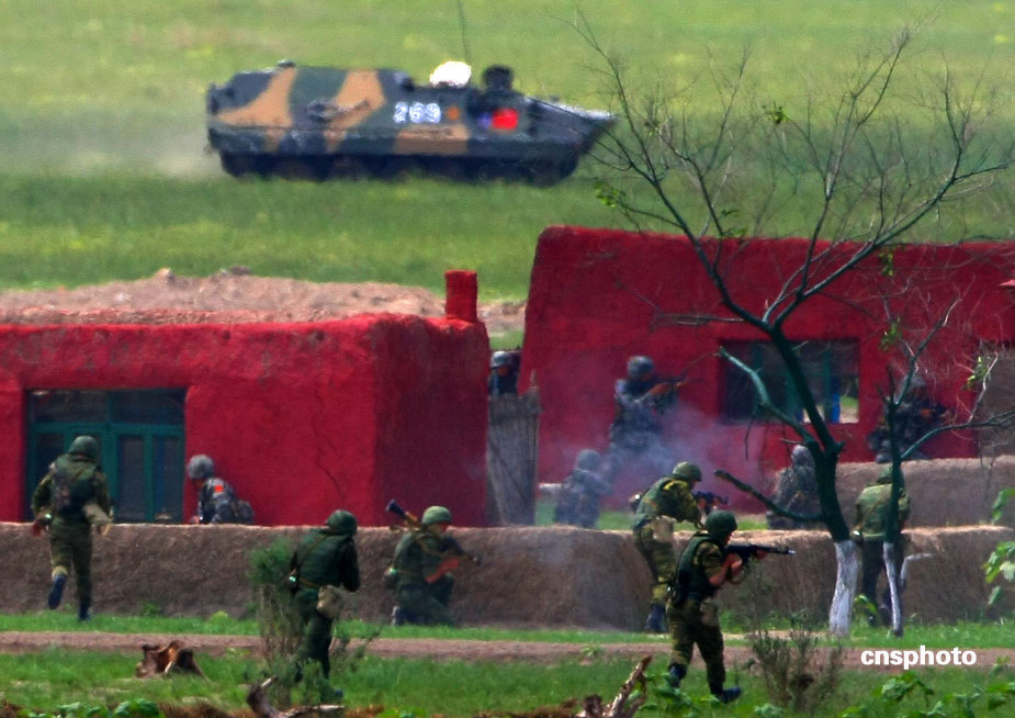 中國、俄羅斯兩軍總參謀長,7月23日上午到沈陽軍區洮南合同戰術訓練基地,觀看“和平使命2009”聯合反恐軍事演習。雙方以陸軍和空軍為主,中方參演部隊包括1個陸軍戰斗群和1個空軍戰斗群。俄方參演兵力包括1個陸軍加強摩步營、1個空降突擊連和部分空軍兵力,雙方投入兵力兩千多人。中新社發 宋吉河 攝