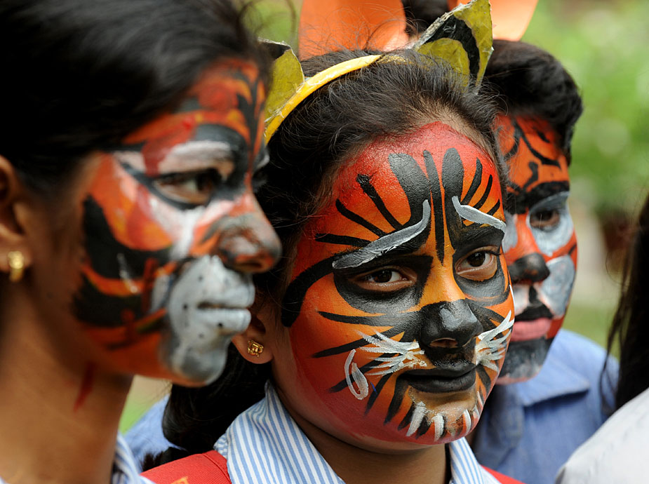 7月28日,約2000名學生在新德里化妝成老虎的臉譜,圍坐成老虎的造型,與官員和野生動物專家們一起呼吁人們保護孟加拉虎和其他野生動物。