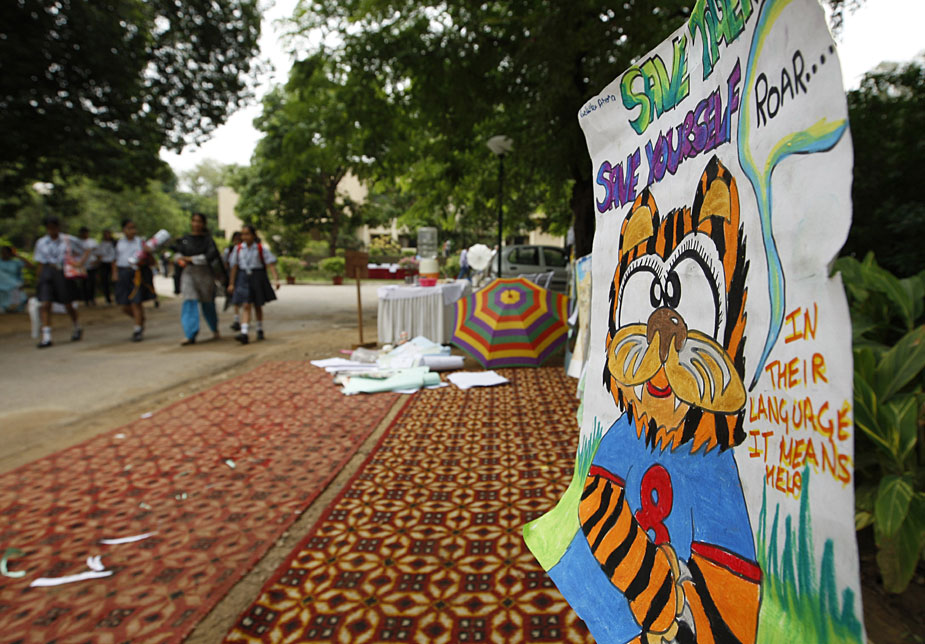 7月28日,約2000名學生在新德里化妝成老虎的臉譜,圍坐成老虎的造型,與官員和野生動物專家們一起呼吁人們保護孟加拉虎和其他野生動物。