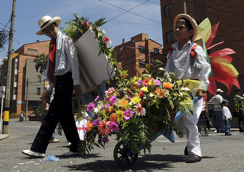 8月1日,在哥倫比亞麥德林,孩子們參加鮮花節游行。鮮花行業是哥倫比亞的主要產業之一。