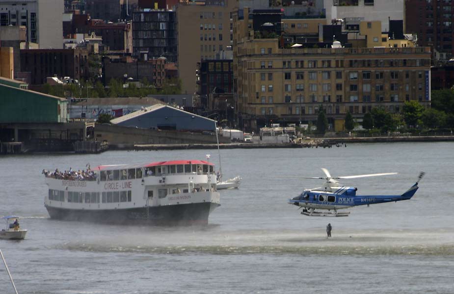 8月8日,紐約市曼哈頓西側的哈德遜河上空,一架觀光直升飛機和一架小型飛機相撞,兩飛機雙雙墜入河中。據稱觀光直升飛機上載有五名意大利游客和一名飛行員,而小型飛機上則有三人。圖為救援直升機在現場搜救。