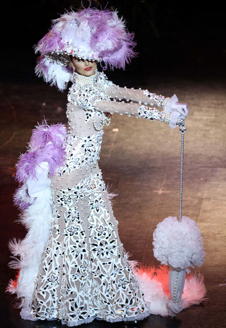 8月10日,2009年世界小姐大賽上,來自84個國家和地區的佳麗進行民族服飾的展示,各國佳麗分別穿著含有自己民族風格元素的時尚晚裝亮相,現場頓時色彩斑斕,美不勝收。