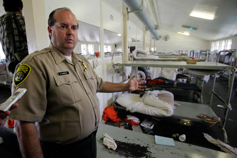圖為哈格雷夫中將描述損壞的奇諾監獄宿舍。8月8日晚至9日凌晨,美國加州南部奇諾市發生大規模監獄騷亂,截至目前,在250多名受傷的在押犯人中,仍有16名犯人在醫院接受治療。