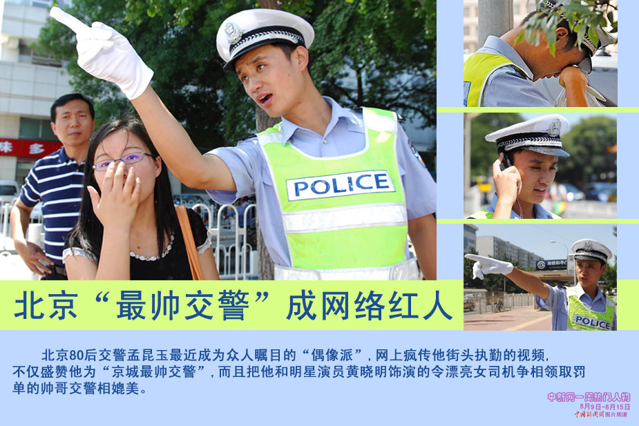 中新網(wǎng)本周熱點(diǎn)人物之最帥交警——1981年出生的孟昆玉因兢兢業(yè)業(yè)地在崗位上奉獻(xiàn)八年,公正執(zhí)法、悉心為民服務(wù)。被網(wǎng)友捧為“北京最帥交警”。