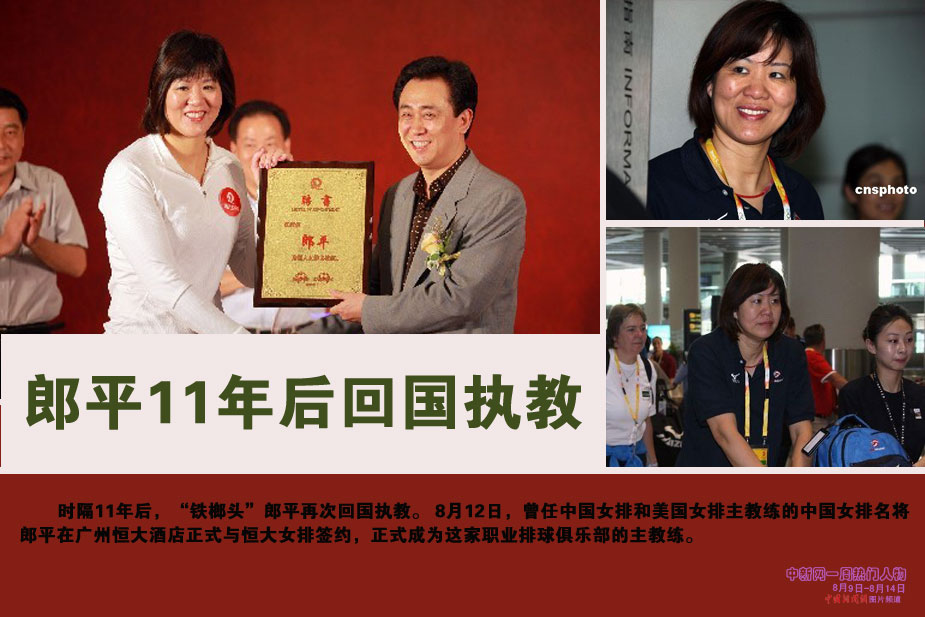 中新網(wǎng)本周熱點(diǎn)人物之郎平——曾任中國女排和美國女排主教練的中國女排名將郎平8月12日在廣州恒大酒店正式與恒大女排簽約,正式成為這家職業(yè)排球俱樂部的主教練。這標(biāo)志著時(shí)隔11年,郎平再次回國執(zhí)教。