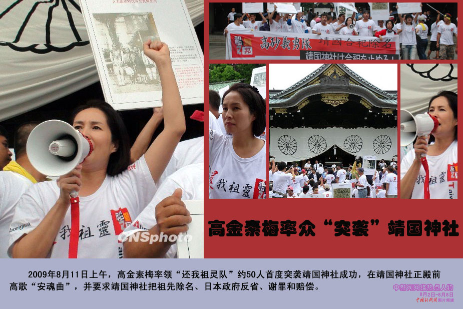 中新網本周熱點人物之高金素梅——高金素梅一行于上午9時30分左右搭車出其不意地抵達靖國神社,隨即高舉“要求靖國還我祖靈”等大型橫布條標語,浩浩蕩蕩地列隊走向靖國神社的正殿,并高喊口號。靖國神社的警衛人員前往阻擋,企圖奪走標語布條,雙方發生肢體沖突。