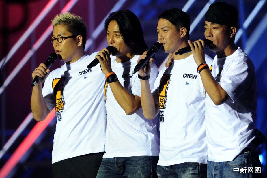 圖為林曉峰、鄭伊健、謝天華、陳小春在現場演出。