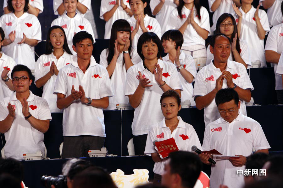 “跨越海峽的愛心”——大陸同胞援助臺(tái)灣“莫拉克”臺(tái)風(fēng)受災(zāi)同胞賑災(zāi)晚會(huì)在北京舉行。眾多文體界明星在現(xiàn)場亮相。圖為郎平、孫海平、仲滿等亮相賑災(zāi)晚會(huì)。中新社發(fā) 杜洋 攝