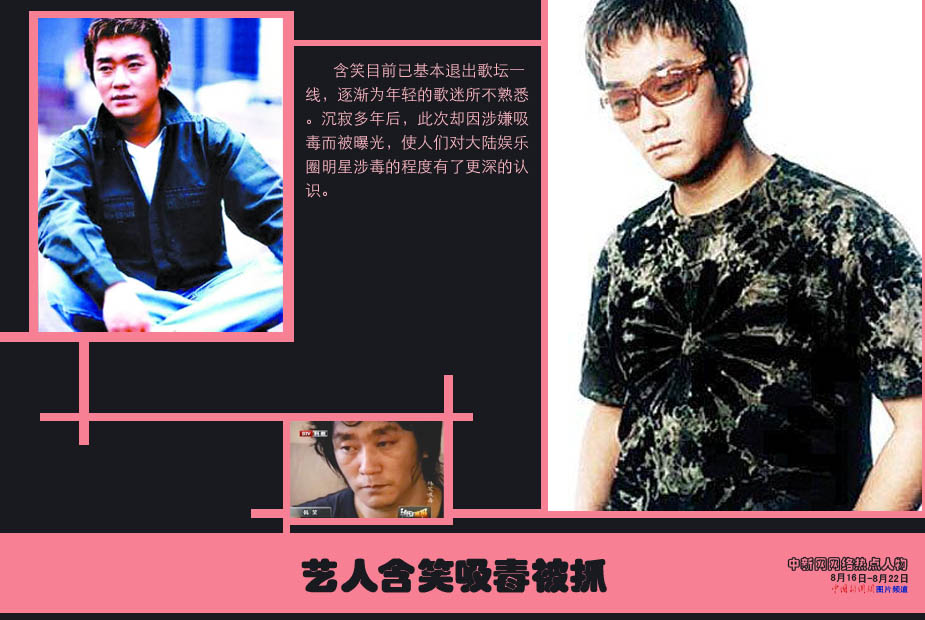 中新網本周熱點人物之——含笑 北京警方十四日證實,市公安局禁毒處根據線索,在京城的兩個城區相繼查獲十名涉嫌吸毒人員并起獲部分毒品,這十名吸毒者中包括了中國著名歌手含笑。