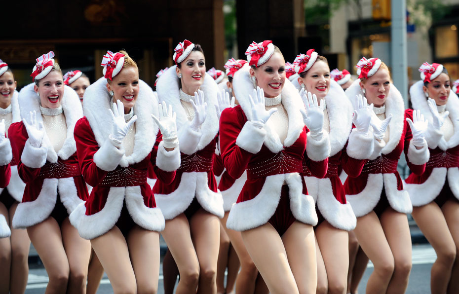 8月25日,美國“火箭女郎”舞蹈團身著圣誕裝在無線電城音樂廳(Radio City Music Hall)前演出。來源:中國新聞網