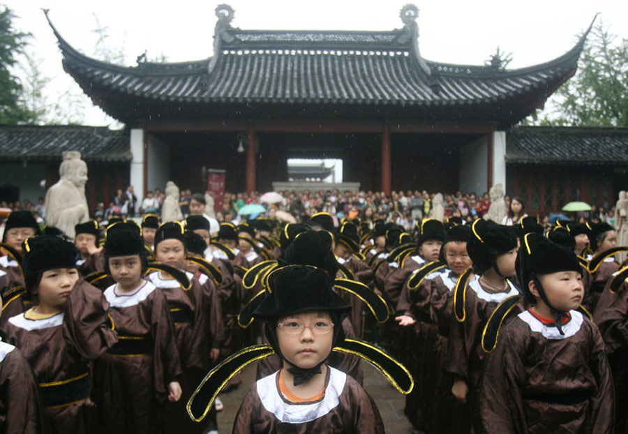 2009年8月31日,南京夫子廟小學一年級新生在南京夫子廟參加了“開筆破蒙”儀式。點朱砂、寫“人”字、念《論語》……接受傳統文化熏陶成為孩子們新學期的第一課。一年級新生穿著統一的“祭孔服”,老師們挨個在孩子們額頭點上朱砂痣,并送上祝福的話。點朱砂,又稱“開天眼”,寓意孩子從此眼明心明,好讀書,讀好書。麥兜/CFP