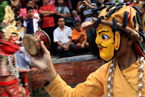 圖為節日當天人們戴上傳統的尼泊爾面具載歌載舞。