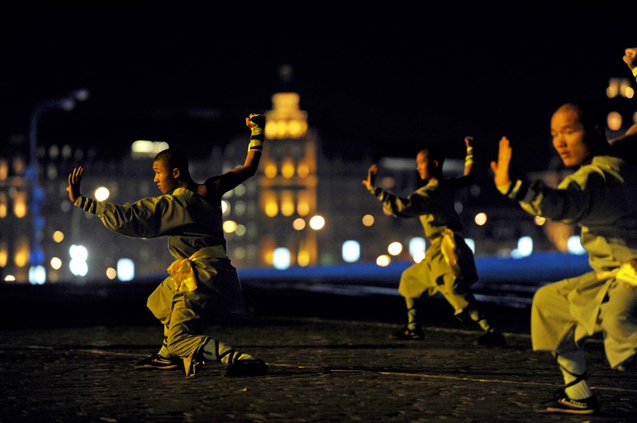 9月4日晚,在俄羅斯莫斯科紅場舉行的俄羅斯國際軍樂節開幕前夕的總彩排上,中國少林武僧在表演節目。