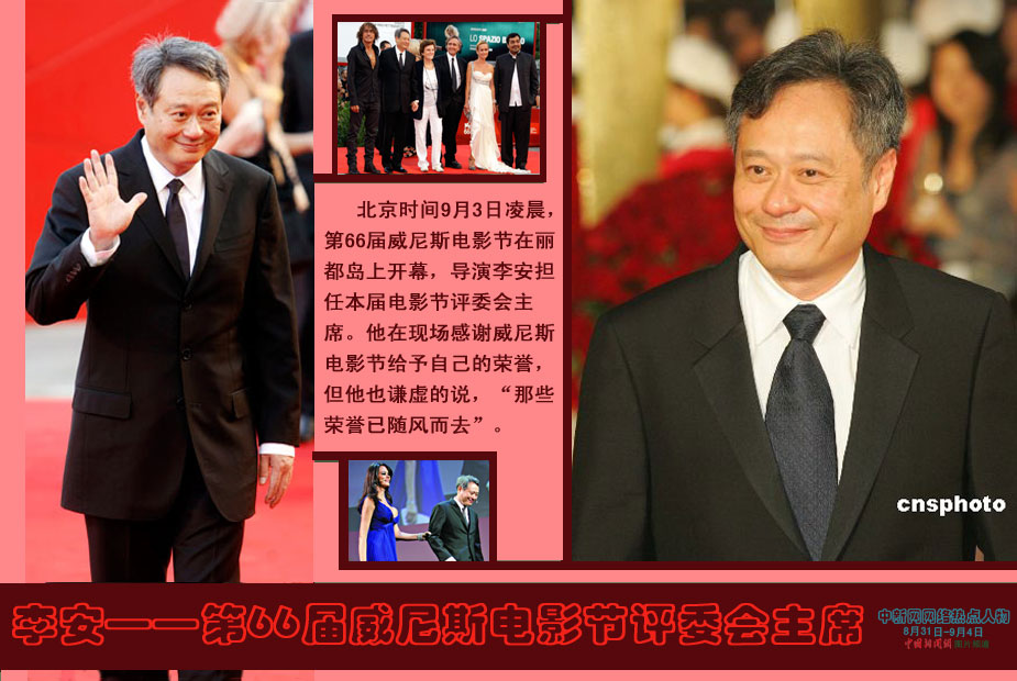 中新網(wǎng)本周熱點(diǎn)人物之——李安 北京時(shí)間9月3日凌晨,第66屆威尼斯電影節(jié)在麗都島上開幕,導(dǎo)演李安擔(dān)任本屆電影節(jié)評(píng)委會(huì)主席。他在現(xiàn)場感謝威尼斯電影節(jié)給予自己的榮譽(yù),但他也謙虛的說,“那些榮譽(yù)已隨風(fēng)而去”。來源:中國新聞網(wǎng)、新京報(bào)