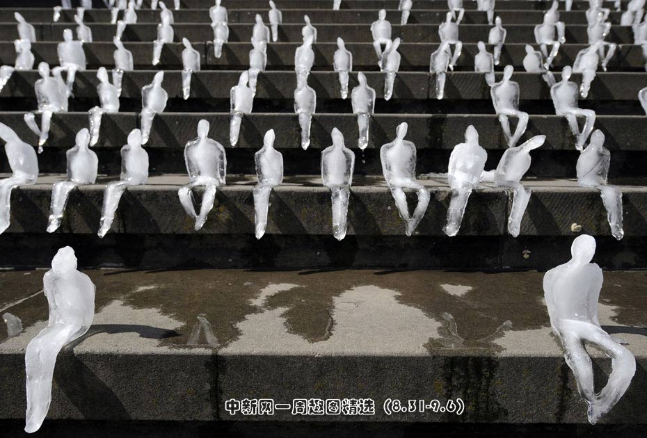 9月2日,德國柏林,世界野生動物基金會(WWF)將1000個小冰人被放置在了御林廣場音樂廳的臺階上,小冰人慢慢融化成水。圖片來源:中國新聞網