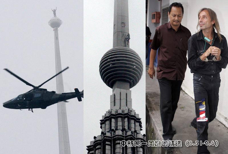9月1日,現年46歲的法國“蜘蛛俠” 阿蘭•羅伯特成功爬上了馬來西亞最高的建筑物——吉隆坡的雙子塔,但隨后被警方逮捕。圖片來源:中國新聞網