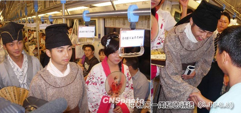 三日上午,三位身著古裝的年輕人在南京地鐵首列品牌列車“人文號”里,與乘客一起朗誦詩歌、知識競答。圖片來源:中國新聞網