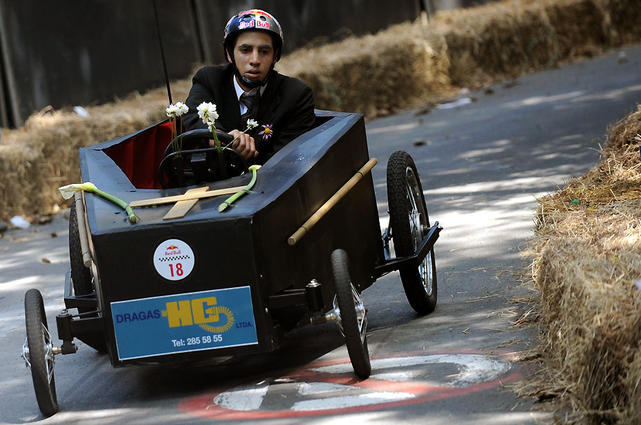 圖為參賽選手帶著自制的“棺材”賽車參加比賽。