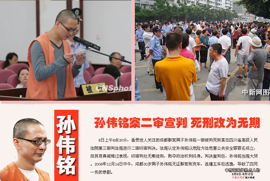 中新網本周熱點人物之——孫偉銘 8日上午8點30分,備受世人關注的成都醉駕男子孫偉銘一審被判死刑案在四川省高級人民法院第三審判法庭進行二審終審判決。法庭認定孫偉銘以危險方法危害公共安全罪罪名成立,但其有真誠悔過表現,終審判處無期徒刑,剝奪政治權利終身。判決宣判后,孫偉銘當庭大哭。2008年12月14日中午,成都30歲男子孫偉銘無證醉駕別克車,連撞五車后逃逸,導致了四死一傷的慘劇。