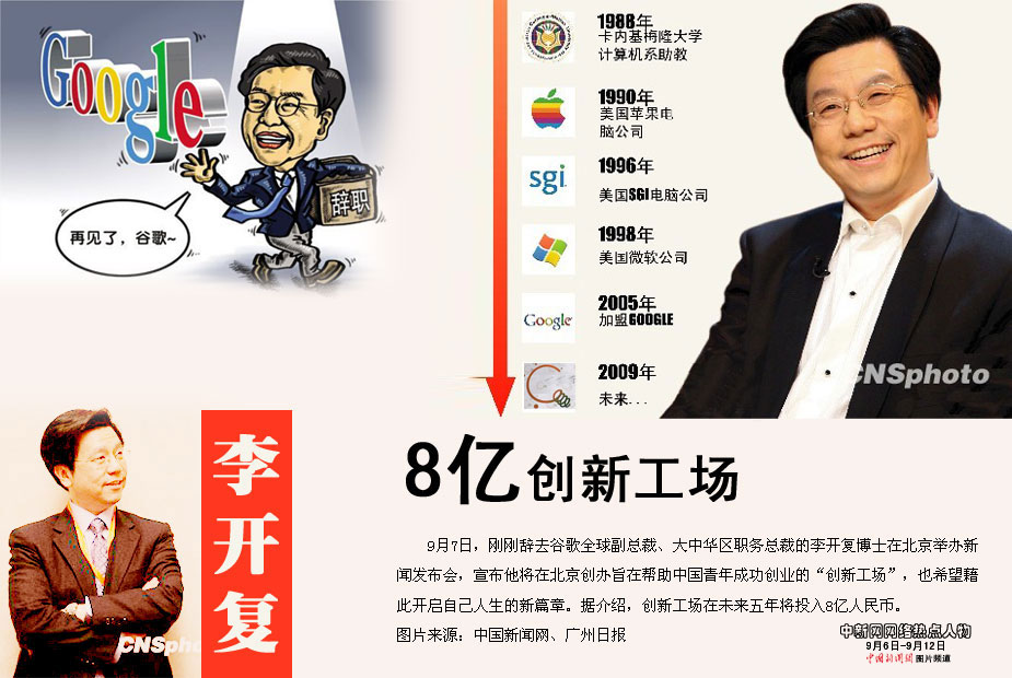 中新網(wǎng)本周熱點人物之——李開復 剛剛辭去谷歌全球副總裁、大中華區(qū)職務總裁的李開復博士在北京舉辦新聞發(fā)布會,宣布他將在北京創(chuàng)辦旨在幫助中國青年成功創(chuàng)業(yè)的“創(chuàng)新工場”,也希望藉此開啟自己人生的新篇章。據(jù)介紹,創(chuàng)新工場在未來五年將投入8億人民幣。