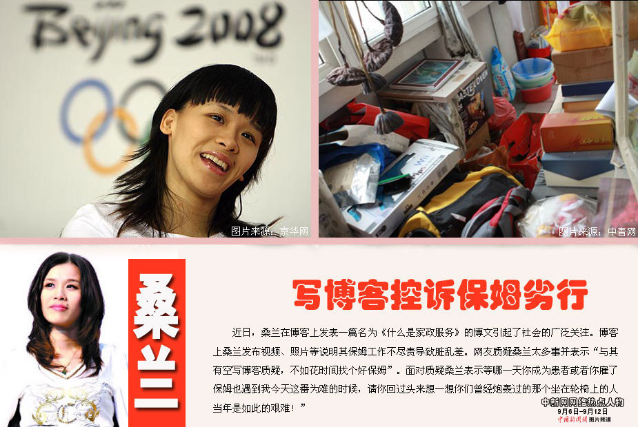 中新網本周熱點人物之——桑蘭 近日,桑蘭在博客上發表一篇名為《什么是家政服務》的博文引起了社會的廣泛關注。博客上桑蘭發布視頻、照片等說明其保姆工作不盡責導致臟亂差。有網友質疑桑蘭太多事并表示“與其有空寫博客質疑,不如花時間找個好保姆”。面對質疑桑蘭稱“別以為‘輪椅事件’ ‘神醫門’‘保姆門’就認為我是個怨婦或者那么唧唧歪歪。等哪一天你坐上輪椅乘飛機,你成為患者或者你雇了保姆也遇到我今天這番為難的時候,請你回過頭來想一想你們曾經炮轟過的那個坐在輪椅上的人當年是如此的艱難!”