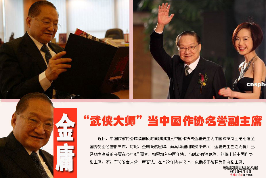 中新網(wǎng)本周熱點人物之——金庸 近日,中國作家協(xié)會聘請前段時間剛剛加入中國作協(xié)的金庸先生為中國作家協(xié)會第七屆全國委員會名譽副主席。對此,金庸慨然應聘,而其助理則向媒體表示:金庸先生當之無愧!已經(jīng)85歲高齡的金庸在今年6月圓夢,如愿加入中國作協(xié)。當時就有消息稱,他將出任中國作協(xié)副主席,不過有關發(fā)言人曾一度否認。在本次作協(xié)會議上,金庸終于被聘為作協(xié)副主席。