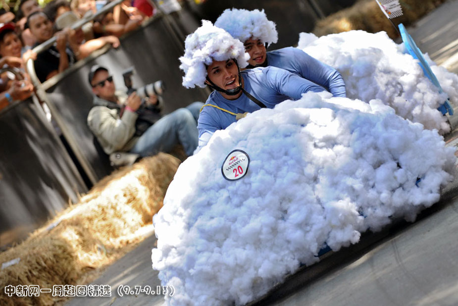 9月6日,哥倫比亞麥德林市舉行了一場別開生面的小汽車競賽,參賽選手帶著各自設計的奇形怪狀的“賽車”前來參加比賽。圖片來源:中國新聞網
