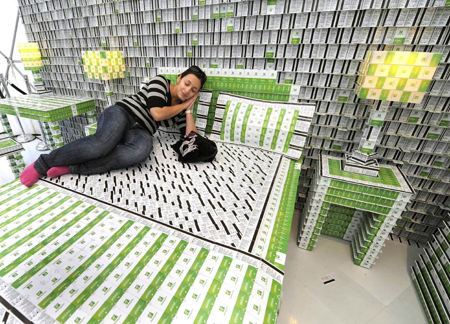 9月17日,在美國紐約,一位名叫布賴恩的設計師展示他利用房門卡設計的客房。這個占地約37平方米的酒店接待大廳、臥室和衛生間是利用20多萬張房門卡搭建而成的。