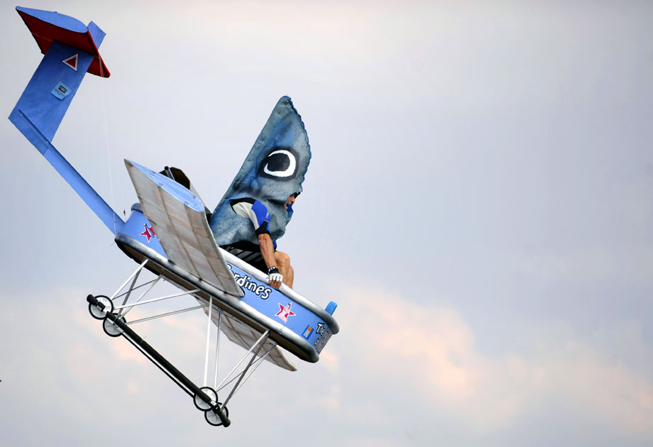 9月27日,法國馬賽趣味飛行器大賽舉行。比賽規則簡單,誰能在落水之前飛得更遠誰就是冠軍,但參賽選手絞盡腦汁,把自己的飛行器扮成各種古怪摸樣。圖片來源:中國新聞網