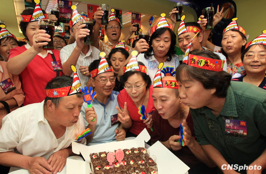 9月23日,上海六十名“共和國同齡人”舉行集體生日派對共賀新中國生日。 中新社發 湯彥俊 攝