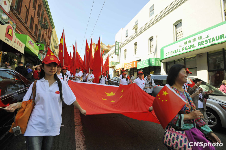 當地時間9月26日,美國舊金山數千華人華僑在舊金山中國城持巨幅國旗游行,慶新中國六十華誕。 圖為中國留美學生、學者的游行隊伍。中新社發 陳鋼 攝