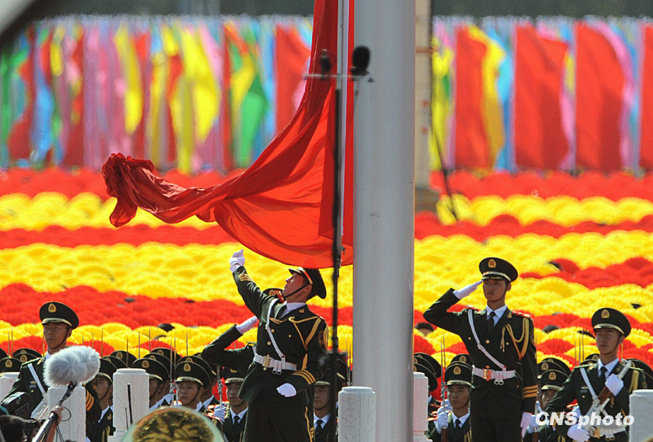 2009年10月1日,中華人民共和國成立60周年慶祝大會在北京天安門廣場舉行。圖為升旗儀式。中新社發 廖攀 攝