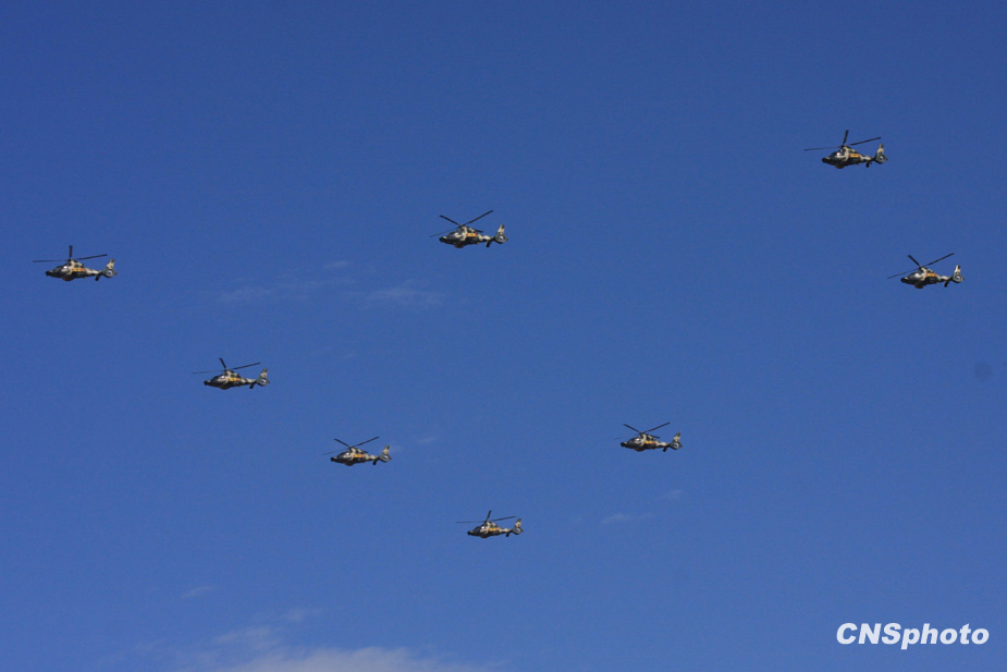 2009年10月1日,中華人民共和國成立60周年慶祝大會在北京天安門廣場舉行。偵察直升機梯隊。中新社發 郭國權 攝
