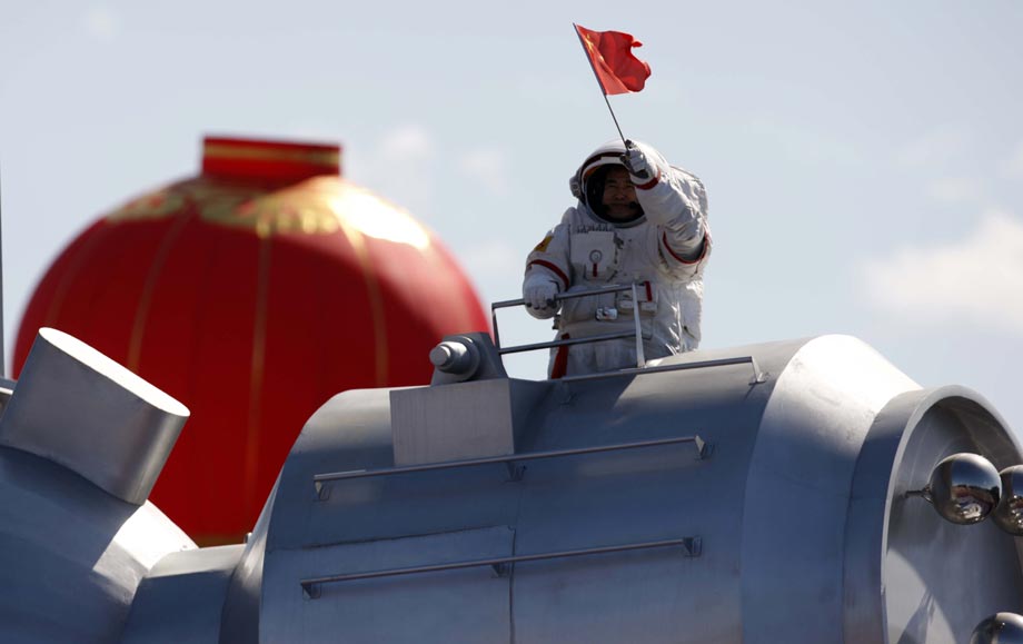 10月1日,中華人民共和國成立60周年慶祝大會在北京舉行,航天員翟志剛等航天人在群眾游行隊伍中亮相。 中新社發 盛佳鵬 攝