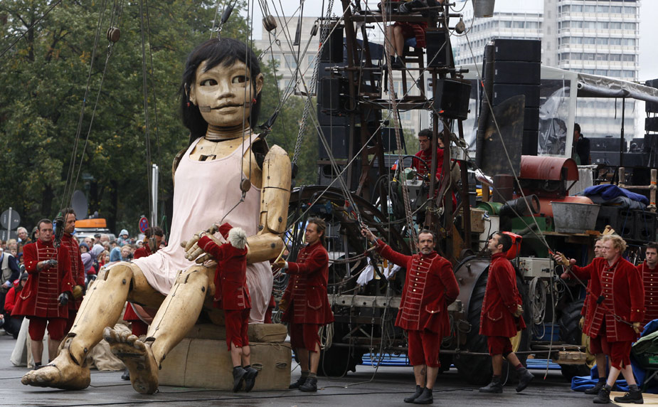 10月2日,來自法國一家戲劇公司的兩個(gè)巨型提線木偶亮相柏林街頭,它們將在露天劇場(chǎng)進(jìn)行表演,以此紀(jì)念柏林墻推倒20周年。