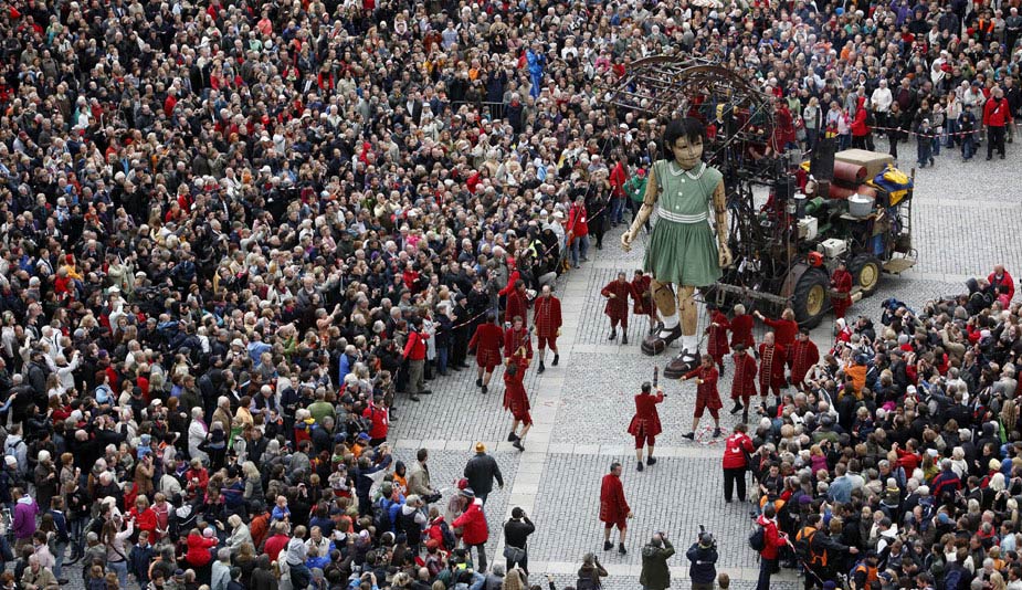 10月2日,來自法國一家戲劇公司的兩個巨型提線木偶亮相柏林街頭,它們將在露天劇場進行表演,以此紀念柏林墻推倒20周年。