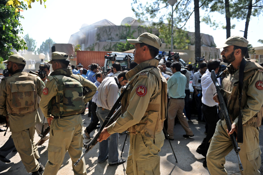 中新網10月5日電 據法新社報道,聯合國位于巴基斯坦伊斯蘭堡的辦公樓內5日發生自殺式襲擊爆炸,導致3人死亡。報道稱,當時有80人在該辦公樓工作,遇害者中包括一名外國人,另外2人是巴基斯坦婦女。還有6名傷者被送往醫院。圖為安全人員在發生爆炸的辦公室附近警戒。