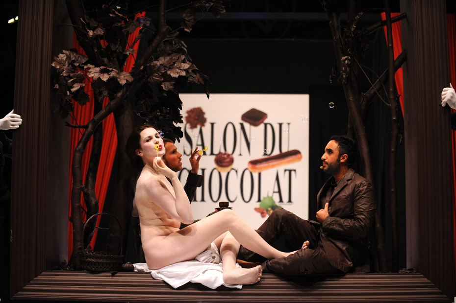 10月13日,第15屆法國巴黎巧克力展開幕,眾多明星身著巧克力服飾亮相。圖片來源:中國新聞網(wǎng)