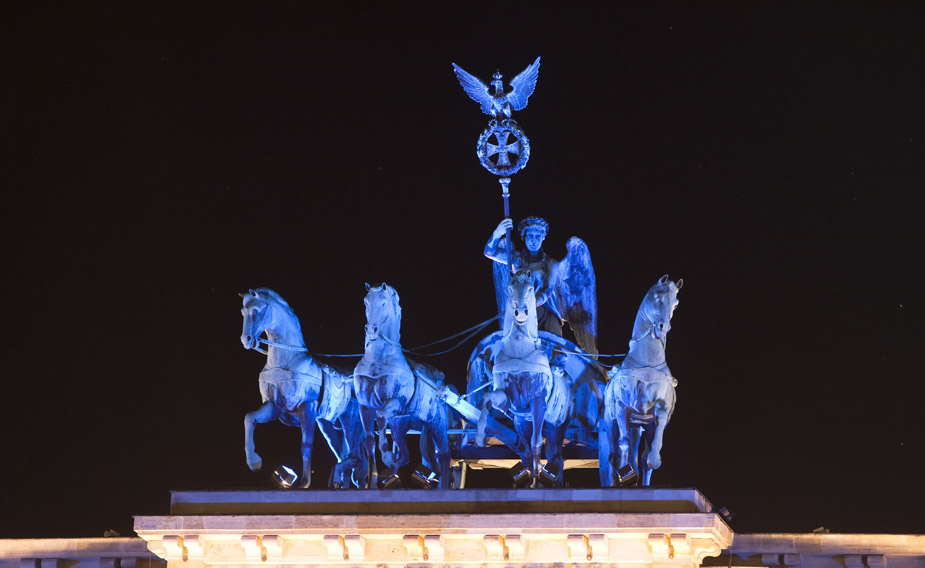10月14日德國柏林將迎來一年一度的“燈節(jié)”。13日晚在德國首都柏林,勃蘭登堡門上的雕塑在“燈節(jié)”預(yù)演中被照亮。