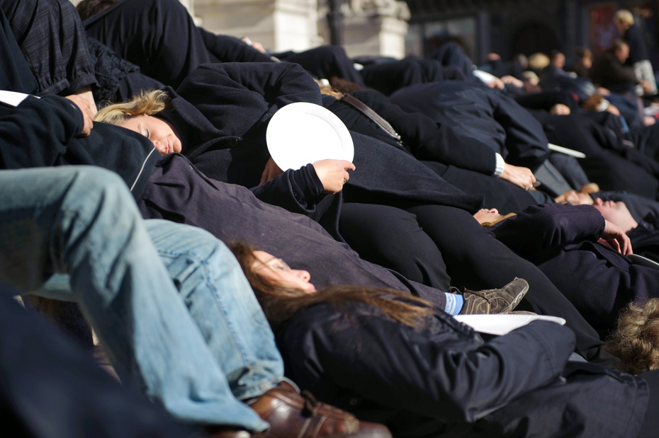 10月15日,示威者身穿黑色衣服、手持空盤子在巴黎歌劇院前抗議。他們此舉是為了呼吁人們關注世界上的饑民。圖片來源:中國新聞網