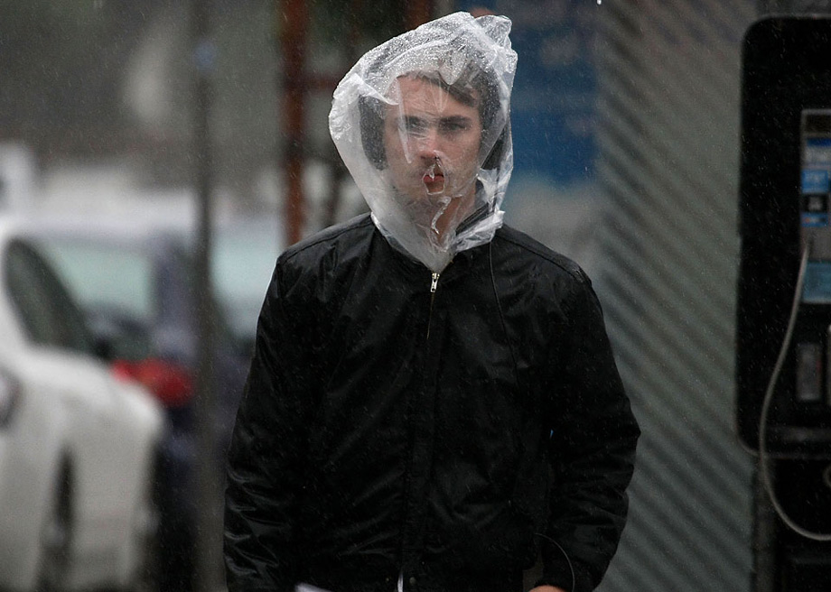 周二(10月13日),美國舊金山街頭一位行人用塑料袋套在頭上,抵擋暴雨。圖片來源:中國新聞網