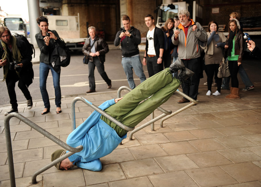 10月16日,來自奧地利的藝術(shù)家威利·多勒帶著他的城市空間人體藝術(shù)團隊,在倫敦街頭進行藝術(shù)表演。幾十位表演者把自己的身體擠進通道入口、壁凹和任何能找得到的公共建筑的縫隙內(nèi),供人們欣賞。