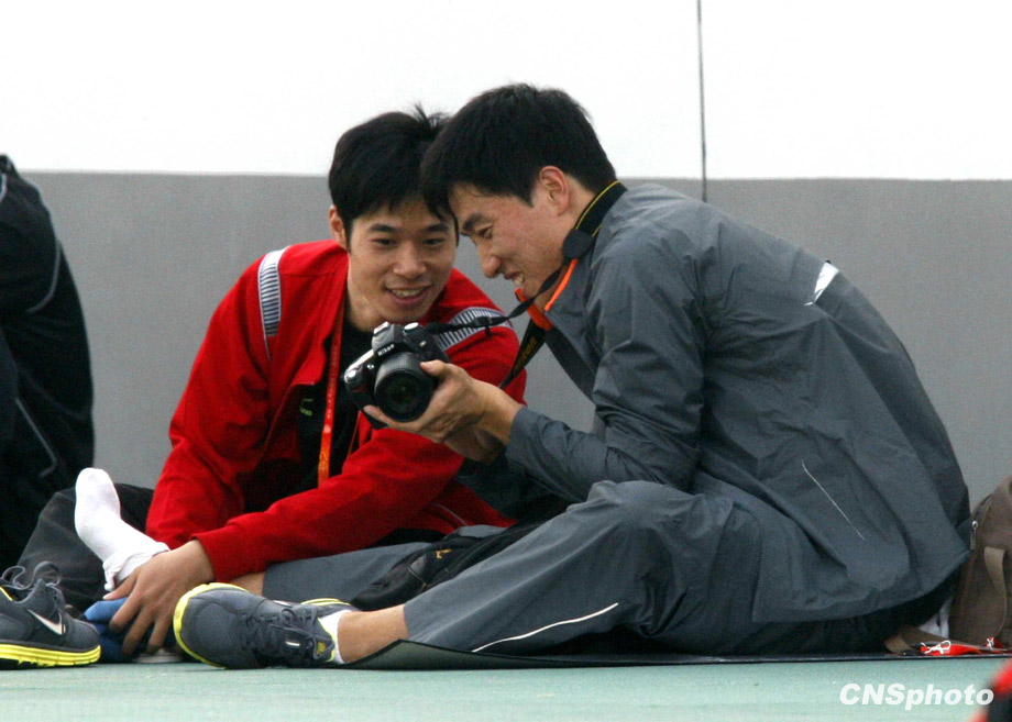 10月22日下午,“飛人”劉翔亮相濟南奧體中心田徑訓練場,訓練間隙手拿相機,客串攝影記者。中新社發 張宇 攝