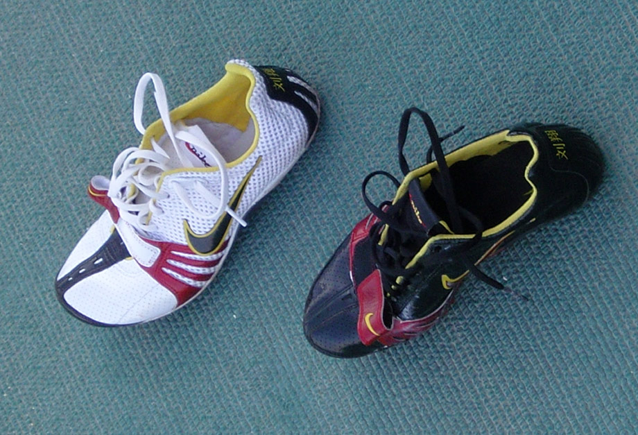 劉翔今天穿了一雙印有他名字的釘鞋,他左腳穿的是白色的新鞋,右腳的黑鞋是相對軟一些、舒適一些的的舊鞋,有利于保護他的傷腳。中新網記者 翁陽 攝
