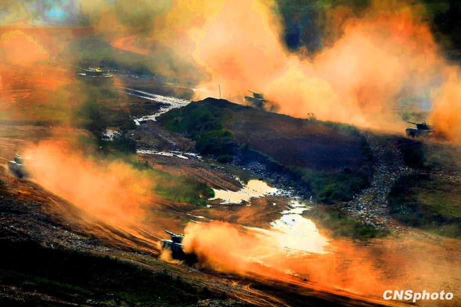 解放軍“前鋒-二00九A”演習(xí),二十二日在濟(jì)南軍區(qū)某合同戰(zhàn)術(shù)訓(xùn)練基地進(jìn)行陸空聯(lián)合火力打擊實(shí)兵實(shí)彈演練。中新社發(fā) 宋吉河 攝