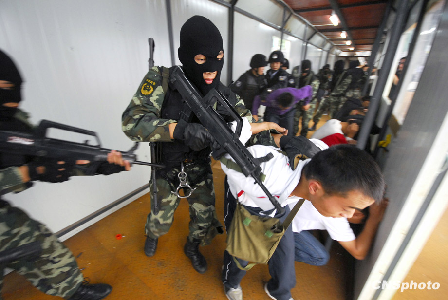 10月23日下午3時40分,推進“平安重慶”建設突發(fā)事件應急演練在該市渝中區(qū)大田灣體育場舉行,重慶各警種突精銳力量重裝登場,將各類事件一一化解。圖為反劫持戰(zhàn)術演練中,武警特種作戰(zhàn)分隊、特警總隊突擊分隊發(fā)起攻擊,一舉捕殲了“恐怖分子”。 中新社發(fā) 郝飛 攝