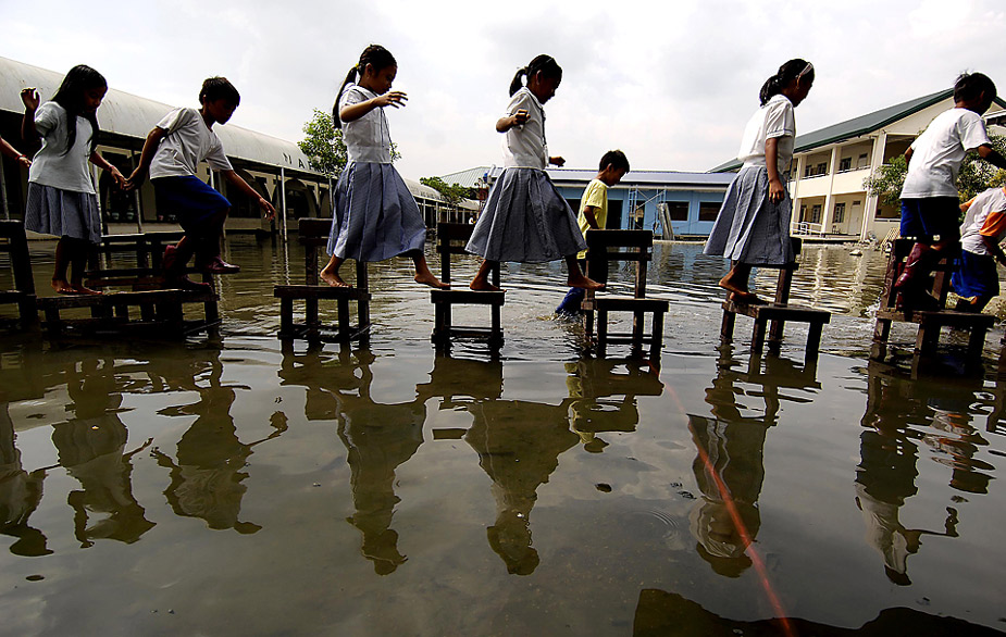 周二(20日)在菲律賓黎剎省,孩子們踩著椅子走過被洪水淹沒的學校操場。臺風“盧碧”給飽受暴雨侵襲的菲律賓北部地區帶來更為強烈的降水。 來源:中國新聞網
