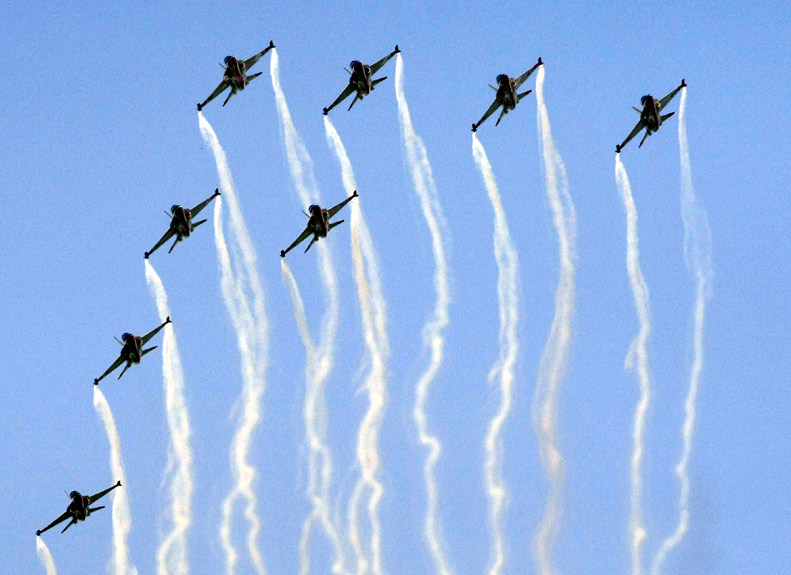 周二(20日),韓國(guó)黑鷹特技飛行表演隊(duì)在2009首爾國(guó)際航空航天與國(guó)防展上進(jìn)行精彩的特技飛行表演。 來源:中國(guó)新聞網(wǎng)